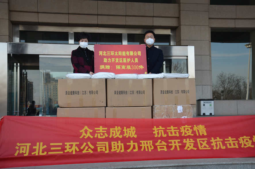 眾志成城,抗擊疫情--河北三環(huán)在行動(dòng)!河北三環(huán)太陽能公司助力邢臺經(jīng)濟(jì)開發(fā)區(qū)抗擊疫情,捐贈(zèng)隔離服300件。